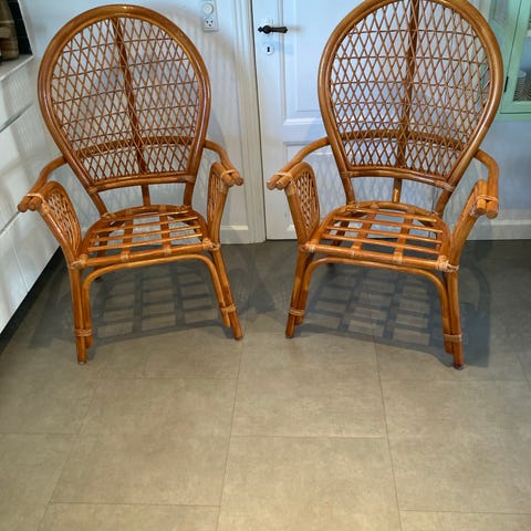Retro - rattan lænestole i naturfarvet flet. Stole med høj, buet ryg og armlæn samt sæde og ryg i tæt rattan-flet. Egnet som siddepladser i stue, udestue eller på overdækket terrasse. Klassisk kurvestol-design med let, åben konstruktion og buede ben og støttebuer for stabilitet.