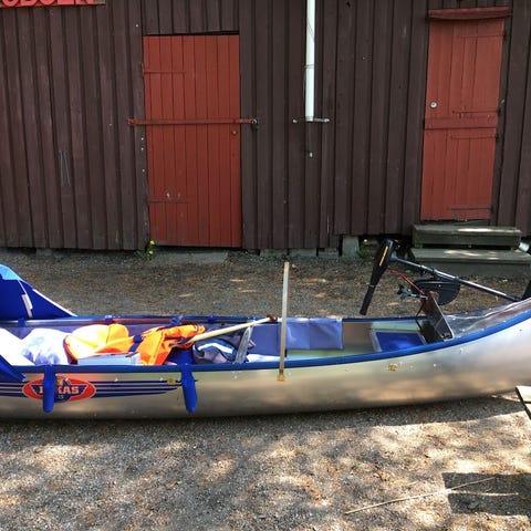 Orange-rød furesøkano. Meget robust ogsikker kano. Beregnet til bla. store søer hvor bølgerne kan blive pænt store. Altid har jeg følt mig tryg i denne kano. Selv med vores nyfødte ombord, og på Klarelven med strøm og forhindringer. Man kan sove i den. 2 voksne side om side og et barn i hver ende.Med flot træræling og diverse tilbehør forefindes. Se billederne.