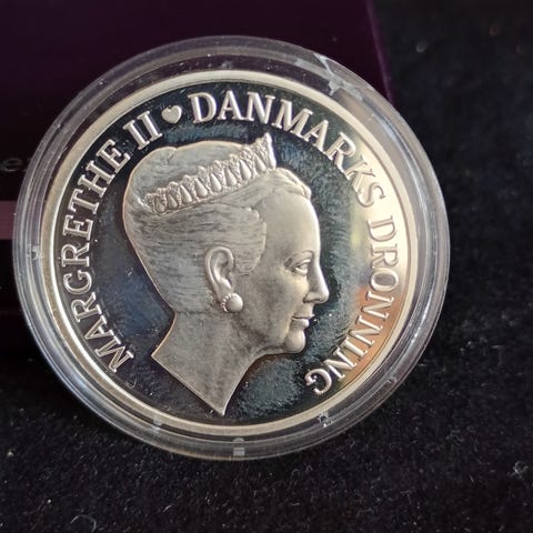I etui. 1940 2010 500 kroner 999 pro mille sølv kom med et bud vurdering 1500 vægt 31,1 gram 999 0/1000 finsølv udført af Lis Nogel og Ronnie Andersen