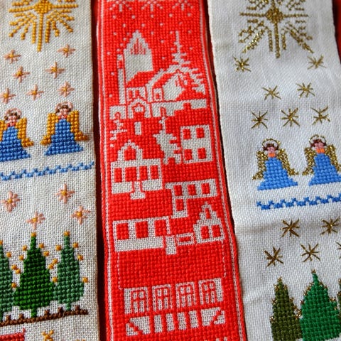 Julehængestykke, broderi og applikation på blåt bomuldsstof. lavet omkring 1960. Leveres nyvasket. Måler 36,5 x 48 cm