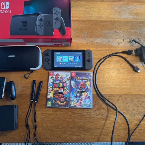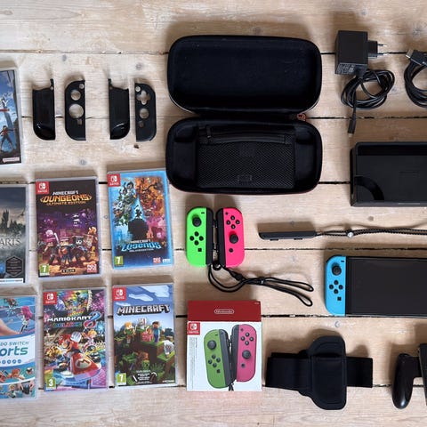 nintendo switch med skærm, spil og tilbehør