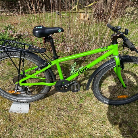 Frog Bike børnecykel med 24" hjul i pink. Cyklen har lige styr, saddel med lav indstigning og reflekser på hjulene. Velegnet som hverdagscykel til større børn, fx til skolekørsel og fritidsbrug på asfalt og lette stier.