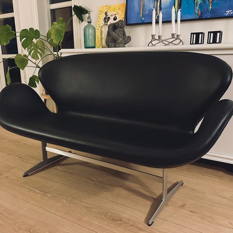 Eksklusiv og ikonisk 2-personers Svanesofa fra Fritz Hansen, model F3321, designet af Arne Jacobsen. Sofaen er betrukket med sort Essential-læder, som er et korrigeret, yderst slidstærkt materiale med et elegant og klassisk udtryk. Perfekt til både private hjem og professionelle omgivelser.