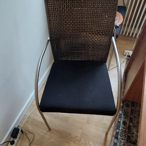 Bisou stol i sort plast med metalben. Sædet og ryglænet er udformet i et sammenhængende plastskalleskal med åbning i ryggen. Benene er runde og fremstår i metal, sandsynligvis forkromet stål. Stolen er egnet som spisebordsstol eller ekstra siddeplads i køkken eller opholdsrum.