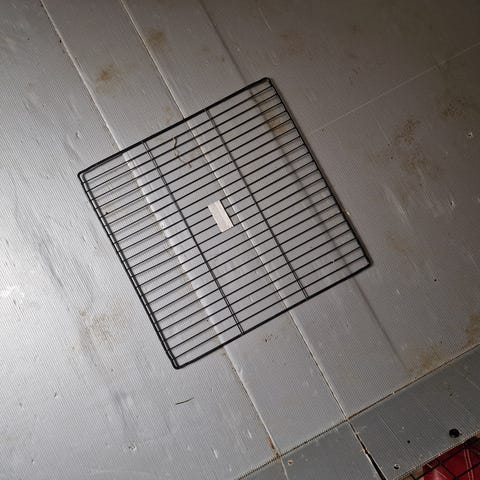 Har fået et lille tryk i bunden, som kan ses på billedet, heraf prisen. Buret har fungeret fint for os alligevel, men grundet katten har vi valgt et, som er lukket