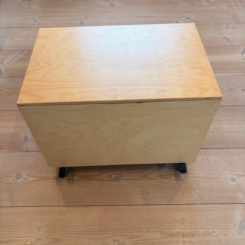 IKEA legetøjskasse i træ med bærehåndtag. Kassen er malet i blå med grønt håndtag og har piratmotiv på siden. Har en god tyngde, så den står stabilt.