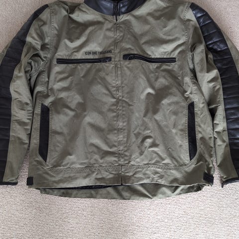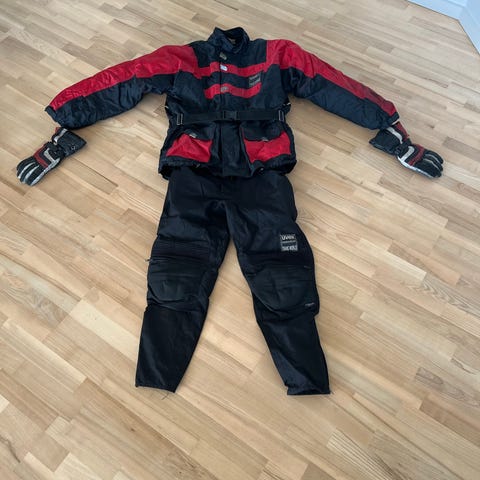 Uvex Trans World motorcykeljakke i blå og grå str . 58. Jakken har broderet Trans Canada-logo på ryggen og Uvex motorstyle-mærke på ærmet. Ydermaterialet er forsynet med Porelle-membran, som er angivet som vandtæt og åndbar. Der er vatteret inderjakke, som kan lynes af. Ryg, skulder og albue beskyttelse. Bukserne er sorte og med smæk, ekstra vatteret på ende og knæ, i str. M.