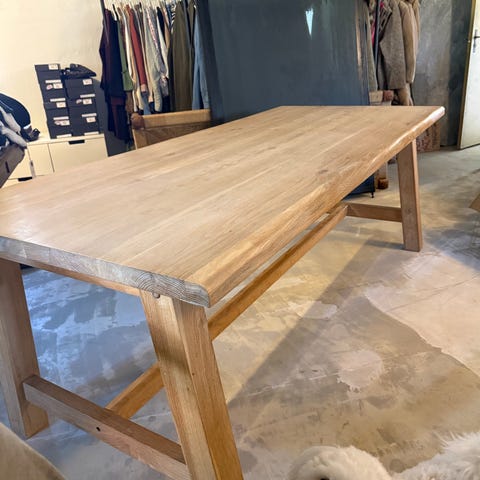 Bordet har brugsspor og skræmmer på kanter og plade (se billeder). Da det er massivt træ hele vejen igennem, er det oplagt til slibning, hvis man ønsker det populære, lyse egetræs-look.