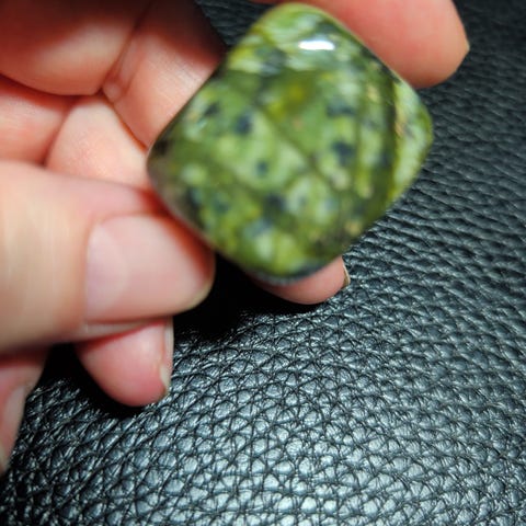 Grøn serpentin er kendt som en beskyttelses- og healingssten, tæt forbundet med jordenergi, ro og indre balance.