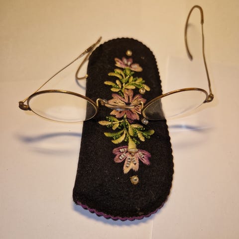 Ukendt mærke ovale briller i unisex-model med metalstel i guldfarve. Brillerne har tynde brillestænger og ovale glas. Stellet fremstår som en klassisk, enkel model, og der ses en lille stempling på indersiden af stellet. Leveres med ældre hårdt etui i mørk farve. Velegnet som brugsbrille, rekvisit eller samlerobjekt afhængigt af styrke og behov. Ekstra lange brillestænger