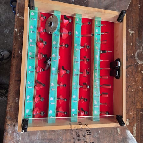 Tilbehør: Indlægsringe (røde) til forskellige fræserstørrelser, højdejusterings-håndtag, anlæg med udsugning og diverse smådele.