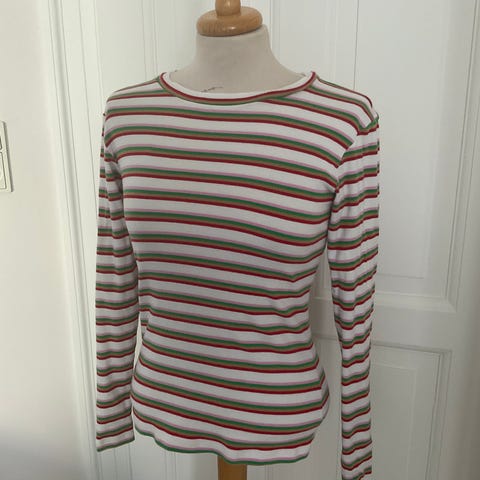 Mads Nørgaard Tuba bluse til kvinder i størrelse M. Blusen er fremstillet i bomuld og har lange ærmer. Den er blå med tonede striber og rund hals.