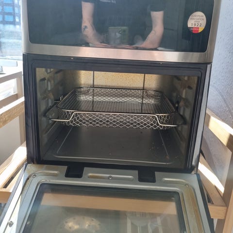 Gastroback Air Fry & Bake miniovn i sort. Bordovn med frontlåge og glasrude samt flere riste og bakker til tilberedning af mad. Velegnet til airfry-funktion, bagning og almindelig ovnbrug i køkkenet eller andre steder med begrænset plads. Tilsluttes med almindelig netledning på bagsiden og har bærehåndtag for nem flytning.