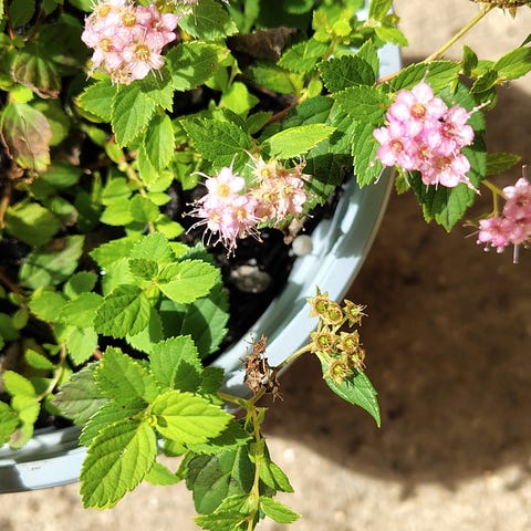 Sandsynligvis Spiraea thunbergii eller vanhouttei. Løvfældende prydbusk, der danner tætte grene og anvendes typisk i haver og hække. Velegnet som solitærbusk eller i grupper i bede og langs terrasser eller stier. Blomstrer med små hvide blomster om foråret og får løv i vækstsæsonen.