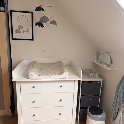 Puslekommode. Skruerne skal spændes i skufferne og puslepladen skal skrues fast og limes, men ellers fungerer den fint. Har ingen lugt. Skal afhentes i Espergærde.