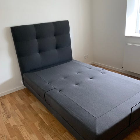 Inkl. hvid topmadras. Sengen er af mærket Linak og har elevation med ledningfri fjernbetjening. Hentes i Allerød.