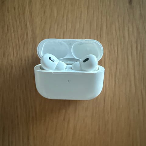 Apple AirPods Pro 2 høretelefoner i hvid. Trådløse in-ear høretelefoner med opladningsetui. Leveres i original æske med opladningsetui, der har Lightning-port til opladning.