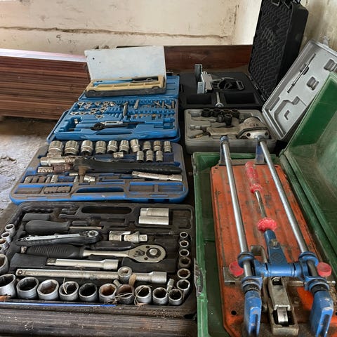 Nakachi varmluftpistol og blandet håndværktøj. Sættet omfatter en elektrisk Nakachi varmluftpistol samt forskelligt håndværktøj, herunder sav, fil, skruenøgle, saks, børste, brækjern, trykluftpistol med manometer og diverse smådele.