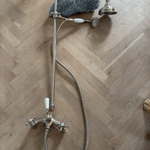 Maxima Classic med donegal armatur 160 c/c svensk standard og udvendigt M26-gevind. Loftbruser på 21 cm. Hele brusesættet er af overfladebehandlet metal (krom) og ingen vitale plastdele. Undtagelsen er grebet på brusegrebet, spm er lavet af hvid resin (porcelænsimitation).