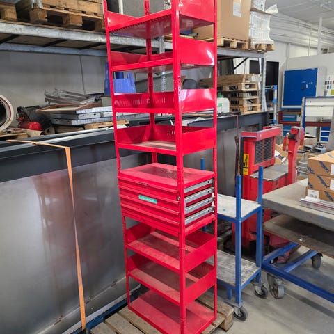 Metalgitter reol på hjul med flere trådkurve. Reolen består af en metalramme med stablede gitterkurve, der giver mulighed for opbevaring og sortering af forskellige genstande. Udstyret med hjul i bunden, så enheden kan flyttes efter behov. Velegnet til lager, butik eller generel opbevaring, hvor der er behov for overskuelig og åben opbevaringsplads.