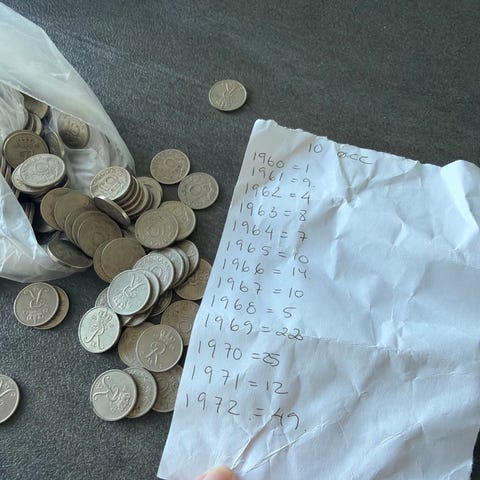 Samling af danske 10-øre mønter i blandede årgange, som blandt andet omfatter år fra slutningen af 1940’erne til slutningen af 1950’erne. Mønterne fremstår brugte og er velegnede til møntsamling, studie af ældre danske mønter eller som supplement til eksisterende samlinger. Antal og præcise årgange fremgår af den håndskrevne oversigt på billederne.