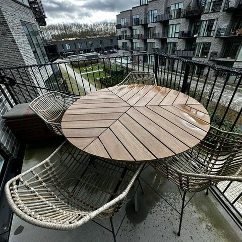 Houe Click havemøbelsæt med rundt bord og matchende stole. Sættet består af et rundt bord med lameller og en rund plade i midten samt stole med lameller og armlæn. Møblerne er udført i metalstel med plastlameller i sort og lyse armlæn. Velegnet til udendørs brug på terrasse, altan eller i have.