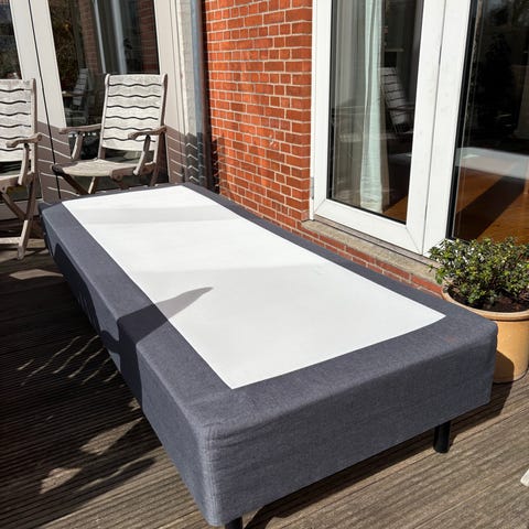 IKEA seng med lamelbund og madras. Sengen har hvid ramme og lamelbund i træ. Madrassen er rektangulær med aftageligt, quiltet betræk og en grøn skumkerne. Top madras, lan medfølger. Velegnet som enkeltseng, fx til børne- eller gæsteværelse. Sengen anvendes med standard enkeltsengemadras