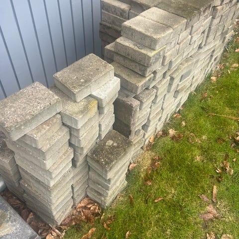 Belægningssten i grå beton egnet til udendørs brug. Stenene ligger stablet på en palle og kan anvendes til fx indkørsel, terrasse, gangsti eller andre belægningsopgaver omkring huset.