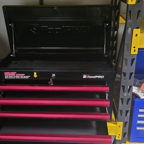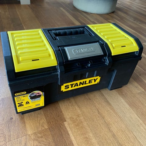 Stanley værktøjskasse på hjul med flere rum og udtræksskuffer. Kassen har teleskophåndtag og store hjul, så den kan trækkes rundt på værksted eller byggeplads. Øverste del fungerer som separat værktøjskasse, og de nederste sektioner har skuffer/rum til opbevaring og organisering af værktøj og tilbehør.