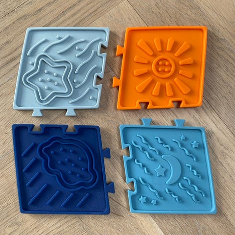 Der er 6 store måtter (ca 24*24 cm) og 12 små måtter (ca 14*14 cm)