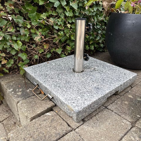 Parasolfod i granit med firkantet sokkel og rustfri stålstang til montering af parasol. Foden har indbygget håndtag/metalbøjle, som er knækket, kan måske fikses.