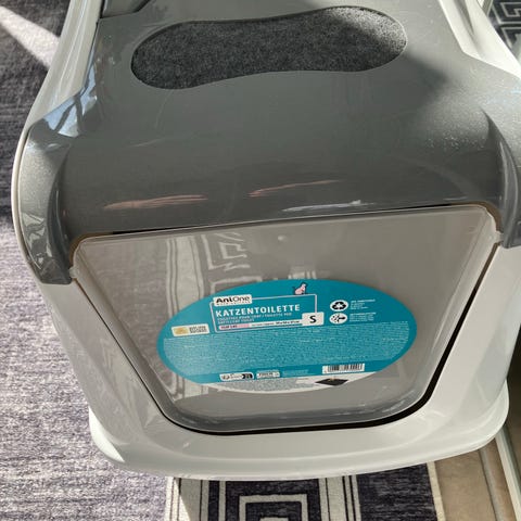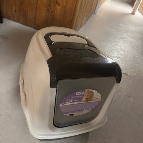 AniOne kattetoilet med låg i hvid/grå sælges. Lukket design mindsker lugt og holder gruset inde. Nem at rengøre og bruge. Medfølger grusske. Brugt, men fungerer fint. Klar til ny kat og nyt hjem.