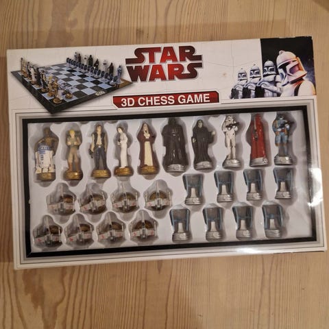 Star Wars skakspil med figurer fra filmuniverset. Spillet indeholder skakbræt og skakbrikker udformet som karakterer fra Star Wars, opdelt i to hold. Egnet til skakspil derhjemme eller som samlerobjekt for Star Wars-interesserede.