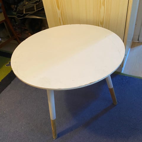 IKEA rundt bord med lyseblå bordplade og ben i lyst træ. Bordet har tre buede ben, der samles på midten og giver et let udtryk. Velegnet som sidebord, sofabord eller lille spisebord i stue, soveværelse eller entré. Bordpladen har synlige brugsspor og afskalninger langs kanten, som ses på billederne.