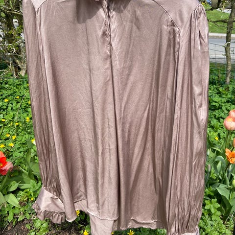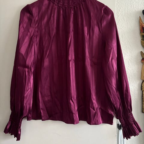 Flot, lyngfarvet bluse med kinakrave og brede manchetter.
