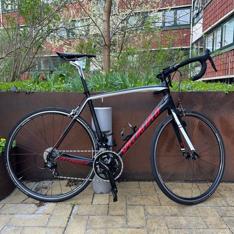 Den har carbon forgaffel, v-bremser, 16x Shimano sora gear og quick release hjul.