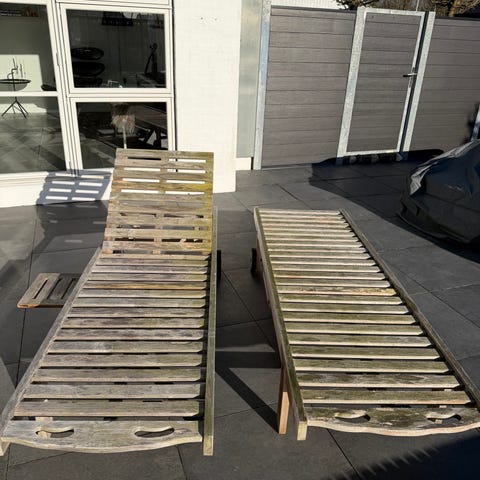 Solvogne i teaktræ på et stel af varmtgalvaniseret stål. 2 stk til salg. Pris pr stk.