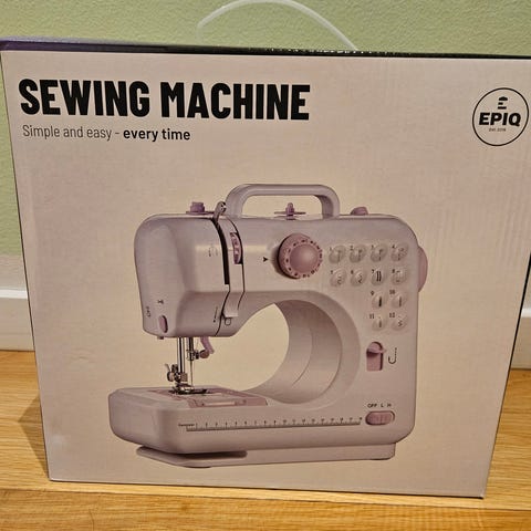 Singer Stitch Sew Quick håndholdt symaskine i hvid og rød plast. Kompakt, batteridrevet model til mindre syopgaver. Leveres med spoler og trådholder som vist på billederne. Egnet til hurtige reparationer af tøj og tekstiler, hvor en almindelig symaskine ikke er nødvendig eller praktisk.