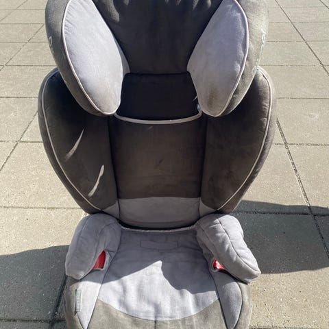 Britax Römer autostol i størrelse 36. Autostolen har integreret 5-punktssele og støtteben, som ses på billederne. Betrækket er i en mørk farve og sædet har polstrede skulderpuder for øget komfort. Egnet til montering i bil til transport af børn i den angivne størrelsesgruppe. Alle justeringsmuligheder og seler fremgår visuelt af billederne.