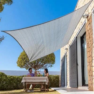Sejlet er fremstillet i HDPE 185 g/m², som er åndbart, robust og vejrbestandigt. Materialet giver UV-beskyttelse og en behagelig luftcirkulation under dugen. De forstærkede hjørner med metalringe, de medfølgende karabiner i jern og det stærke nylonreb gør opsætningen enkel på pæle, træer eller vægge - helt uden værktøj.