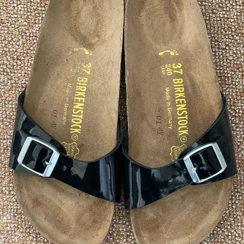 Birkenstock sandaler i størrelse 38. Sandalerne har sort overdel med tårem og justerbar rem med spænde. Indersålen er formstøbt og følger fodens form, og mellemsålen er i kork med sort ydersål. Velegnet som hverdagssandal i sommerhalvåret eller som indesko.