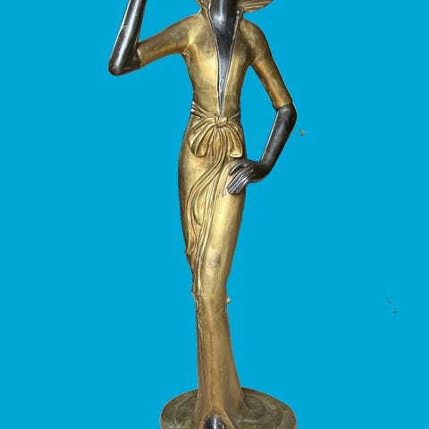 Den står på en solid marmorsokkel, som giver et eksklusivt udtryk og god stabilitet. Den grønlige patinering på kjolen giver figuren et flot spil og kunstnerisk finish.