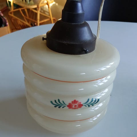 Glasskærm mangler, så lampen sælges som restaureringsobjekt eller til samlere, der ønsker at finde en passende original eller reproduceret skærm.