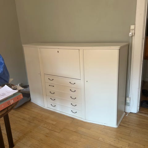IKEA skænk med guld låger og skuffer i hvid. Skænken har flere skabsrum med fyldningslåger samt øverste skuffe, alle med runde greb. Møblet står på ben, hvilket giver luft under skænken og gør det nemmere at rengøre gulvet. Egnet til opbevaring i stue, spisestue eller entré, f.eks. til service, tekstiler eller diverse hverdagsting. Helt rent da den har været dækket med et plastik lag