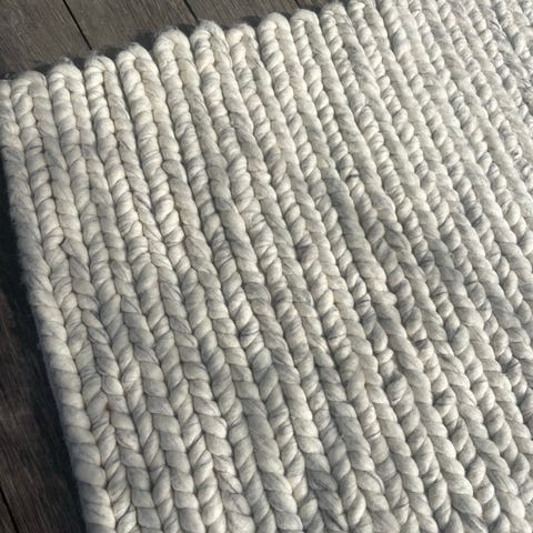 Lækkert og stilrent gulvtæppe i uldlook sælges. Tæppet måler 200 x 300 cm og passer perfekt under spisebord, i stue eller større rum.