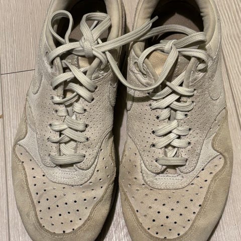 Nike Air sneakers i str. 42. Modellen er i grå med gule Nike-logoer og hvid mellemsål. Overdelen er i tekstil og syntetisk materiale med snørelukning. Ydersålen er i gummi med mønster for bedre greb. Velegnet som hverdagssko og fritidssko.