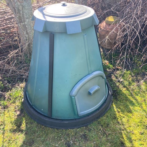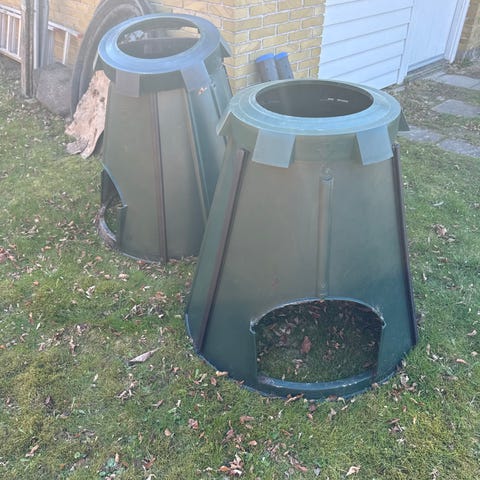 Kompostbeholder i grøn plast til kompostering af haveaffald og køkkenaffald. Beholderen har kegleformet design med låg foroven og låge forneden til udtagning af kompost. Egnet til placering i haven direkte på jorden, så regnorme og mikroorganismer kan medvirke til nedbrydning af organisk materiale.