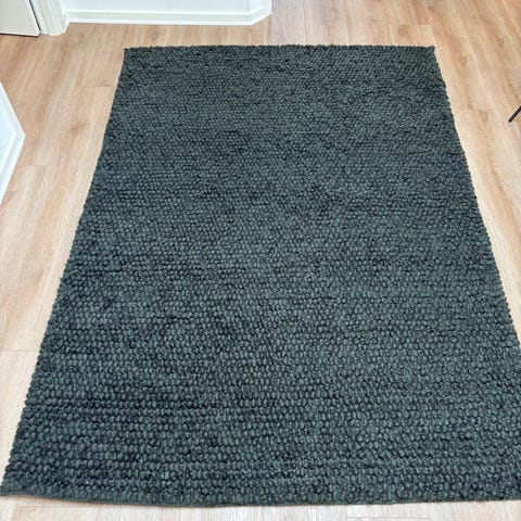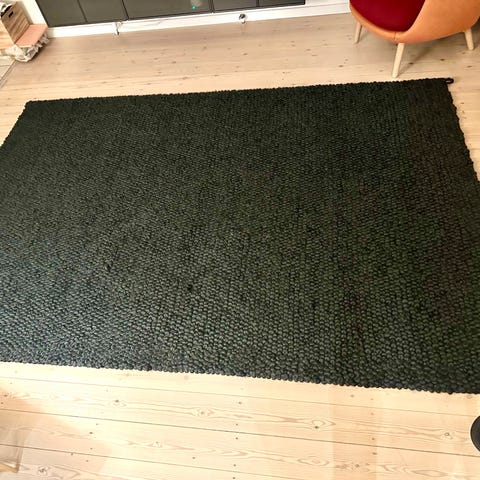 Hay tæppe i grå nuance. Rektangulær form med kraftig, strukturvævet overflade. Egnet til brug i f.eks. stue, soveværelse. Uld 170 x 240 cm. Nypris 3999 kr