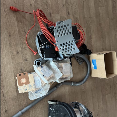Nilfisk Backuum rygstøvsuger i grå farve. Støvsugeren bæres på ryggen med polstrede seler og er udstyret med lang ledning, fleksibel sugeslange, teleskoprør i metal og standard gulvmundstykke. Egnet til støvsugning af gulve og områder, hvor der er behov for mobilitet og rækkevidde, f.eks. trapper og større rum.