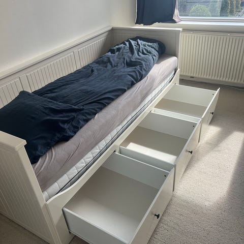 Sælger en praktisk og flot IKEA Hemnes udtræksseng i hvid. Perfekt som både enkeltseng og dobbeltseng – kan nemt trækkes ud og bruges som gæsteseng.